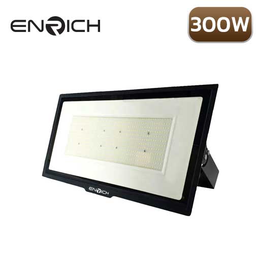 สปอร์ตไลท์ LED ENRICH ECO FIT 300W มีทั้งแสงส้ม 3000K Warm White และแสงขาว 6500K Daylight ให้เลือกตามความต้องการ ให้ความสว่างสูงสุดถึง 30,000 Lumen หรือ 100 Lumen/Watt ไม่มีสารปรอท ไม่ปล่อยลำแสงยูวี และ รังสีอินฟราเรด ลำแสงแบบเย็น อายุการใช้งานยาวนาน 50,000 ชั่วโมง เปิดติดได้ทันทีโดยไม่มีการกระพริบ ติดตั้งง่าย และปรับมุมองศาได้ตามใจต้องการ ทำให้สะดวกและประหยัดเวลาเพิ่มขึ้น เหมาะสำหรับการใช้งานทั้งภายในและภายนอกอาคาร เช่น สนามกีฬาภายในและภายนอก ที่จอดรถ ป้ายโฆษณา ท่าขนส่งสินค้า สเตเดียม เป็นต้น ซึ่งสามารถใช้ส่องสว่างได้ระยะไกลตั้งแต่ 10 เมตร ถึง 30 เมตร รับประกัน 1 ปี และได้มาตรฐาน มอก. 1955-2551