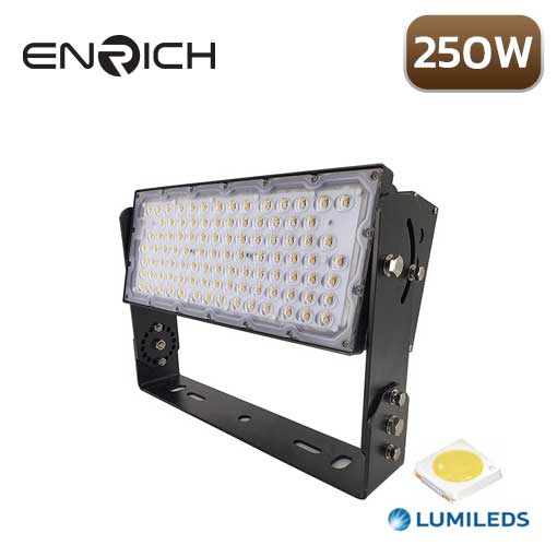 สปอร์ตไลท์ LED ENRICH Highmast XP 250W แสงขาว Daylight 6000-6500K มีดวงไฟทั้งหมด 98 ดวง ภายในแต่ละดวงมี Lumileds Chip ซึ่งเป็นชิป LED คุณภาพสูงเกรดเดียวกับที่ PHILIPS เลือกใช้ติดตั้งอยู่ 4 เม็ด สามารถส่องสว่างกระจายเต็มพื้นที่ มุมกระจายแสง 90°x120° ผลิตจากอลูมิเนียมคุณภาพสูง ทำให้ตัวโคมมีความแข็งแรง ทนต่อการกระแทกได้ดี ตัวโคมไฟสปอร์ตไลท์มีแผงครีบระบายความร้อน กันน้ำกันฝุ่นได้ระดับ IP65 เหมาะสำหรับติดตั้งบริเวณกลางแจ้งเช่น สวนสาธาณะ สนามกีฬาทั้งในร่มและกลางแจ้ง ที่จอดรถ โกดังสินค้า ท่ารถขนส่ง เป็นต้น มีระบบป้องกันไฟกระชาก Surge Protection 4kV อายุการใช้งาน 50,000 ชั่วโมง รับประกัน 3-5ปี และได้รับมาตรฐานมอก. 1955-2551